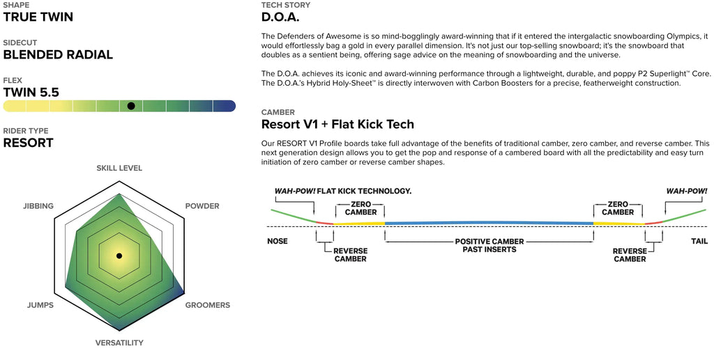 The CAPiTA D.O.A. (Defenders of Awesome) Snowboard is one of the most celebrated boards in the industry, designed for riders who want true all-mountain freestyle performance. With a versatile true twin shape and Resort V1 profile, it blends the pop and response of camber with the predictability of rocker. Its lightweight FSC Certified Dual Core keeps the board lively without sacrificing strength, while Carbon Fiber Boosters add stability and snap for powerful turns and takeoffs. Whether you’re carving groomers, lapping the park, or exploring the whole mountain, the D.O.A. delivers award-winning performance season after season.