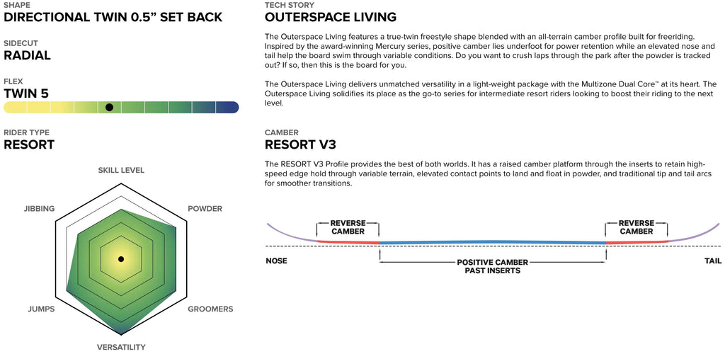 The CAPiTA Outerspace Living Snowboard is built for riders who want the perfect balance of freestyle fun and all-terrain performance. With a true twin shape and all-terrain camber profile, it blends the energy and control of positive camber underfoot with elevated nose and tail for float in variable conditions. Inspired by the award-winning Mercury series, this board is equally at home lapping the park, carving groomers, or charging freeride lines. Versatile and playful, the Outerspace Living is your ticket to ride everywhere on the mountain.