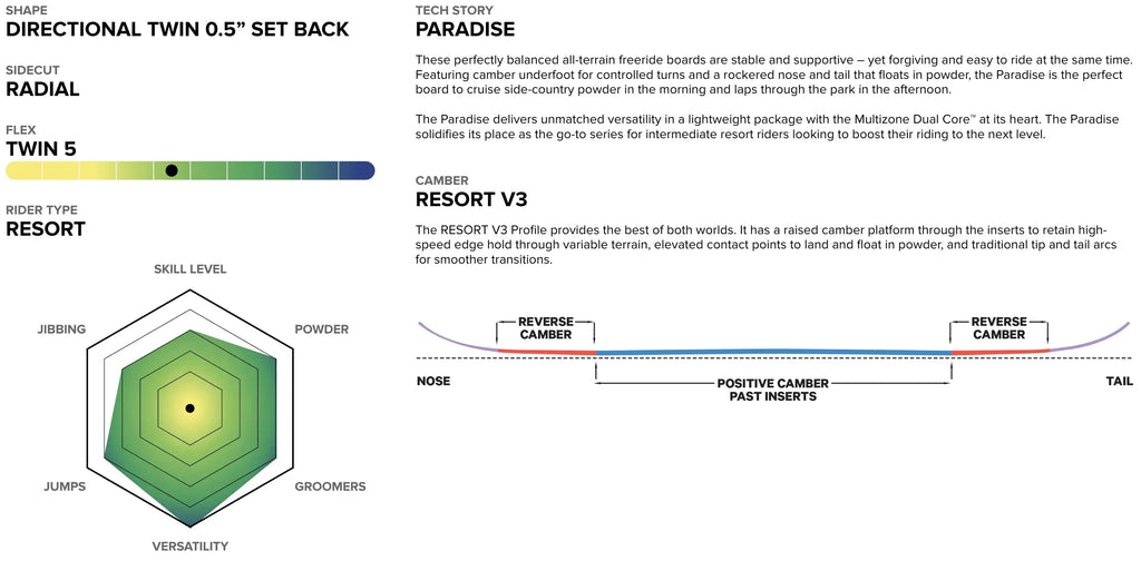 The CAPiTA Paradise Snowboard delivers the perfect mix of fun, flow, and progression. Inspired by the men’s Outerspace Living, this women’s-specific directional twin is built for riders who want all-mountain versatility with freestyle performance. Its Multizone Dual Core keeps the board lightweight yet durable, while carbon fiber boosters add snap and stability for confident turns and takeoffs. Whether you’re carving groomers, cruising side hits, or lapping the park, the Paradise is your ticket to effortless riding across the entire resort.