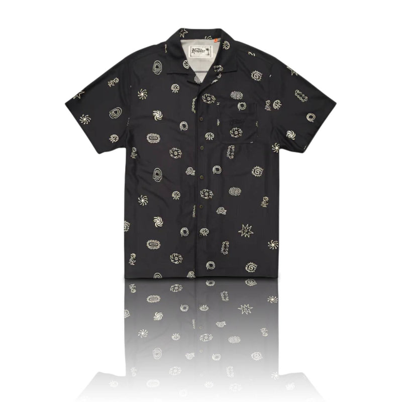 Stay cool and stylish with the Palapa Tech Shirt - Mementos in Black, designed for those who need both function and fashion in the heat. Crafted from 100% recycled polyester mesh, this vintage-inspired shirt is lightweight, breathable, and quick-drying, making it perfect for hot days and warm nights. The coconut buttons, camp collar, and tonal embroidery add a touch of timeless style, while the straight hem with side vents ensures a relaxed, comfortable fit. Whether you're at a summer BBQ or out on the town, this shirt will keep you looking and feeling fresh.